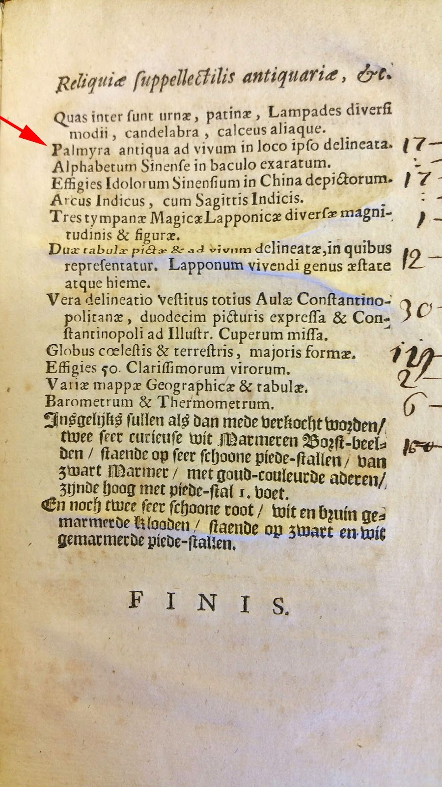 In July 1692, Calckberner came up trumps. He wrote a letter saying that he would be sending Cuper some rare ancient coins, plus a copy of the travel report written by a minister [Halifax] in the company of the first Europeans who had visited Palmyra -- undoubtedly the source for Cuper's scoop in the Journal des Sçavans -- and a painting depicting those ancient ruins, which the painter was still working on. The promised items, including the painting (below), were shipped to Cuper on 3 April 1693.